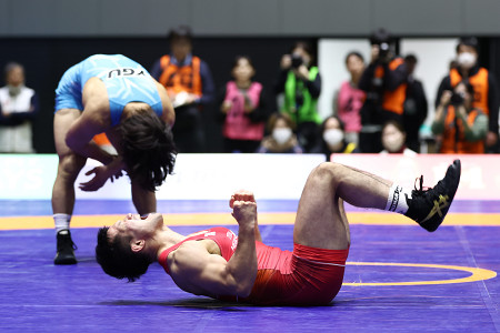 レスリングの全日本選手権第3日。男子フリースタイル70キロ級で優勝し喜ぶ成国大志(手前)。グレコローマンスタイル72キロ級との2冠を達成した=20日、東京・駒沢体育館 【時事通信社】