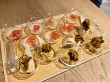 今回は、イタリアン「Cassolo」が「Tearoom」(渋谷区)の「煎茶パウダー」を使った「静岡県産煎茶のスフレチーズケーキ」、パエリア専門店「EL TRAGON」が「シーベジタブル」(高知県安芸市)の「すじ青のり」を使った「スペイン産塩鱈のブニュエロ」、「CRAFT BEER MARKET 虎ノ門店」が「CRUST JAPAN」(大阪市)の「CRUST BBA」を使った「CRUST BREAKING BREAD ALE」を用意した。